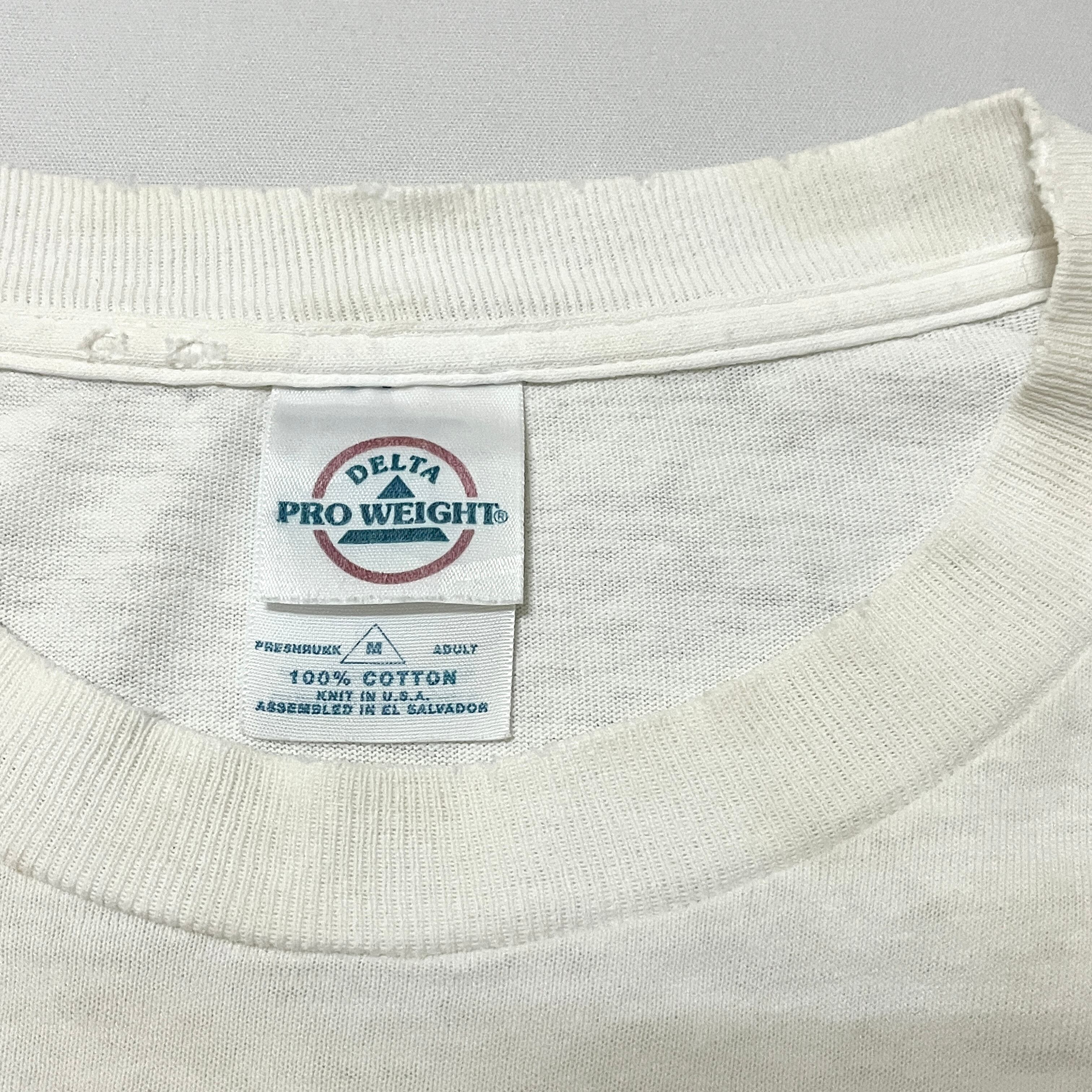 ■状態 全体的に着用による使用感。襟リブに擦り切れダメージ。襟部、胸部、腹部、左袖にうっすら黄ばみ汚れ。腹部にピンホール。背中に小さなサビ汚れがございます。