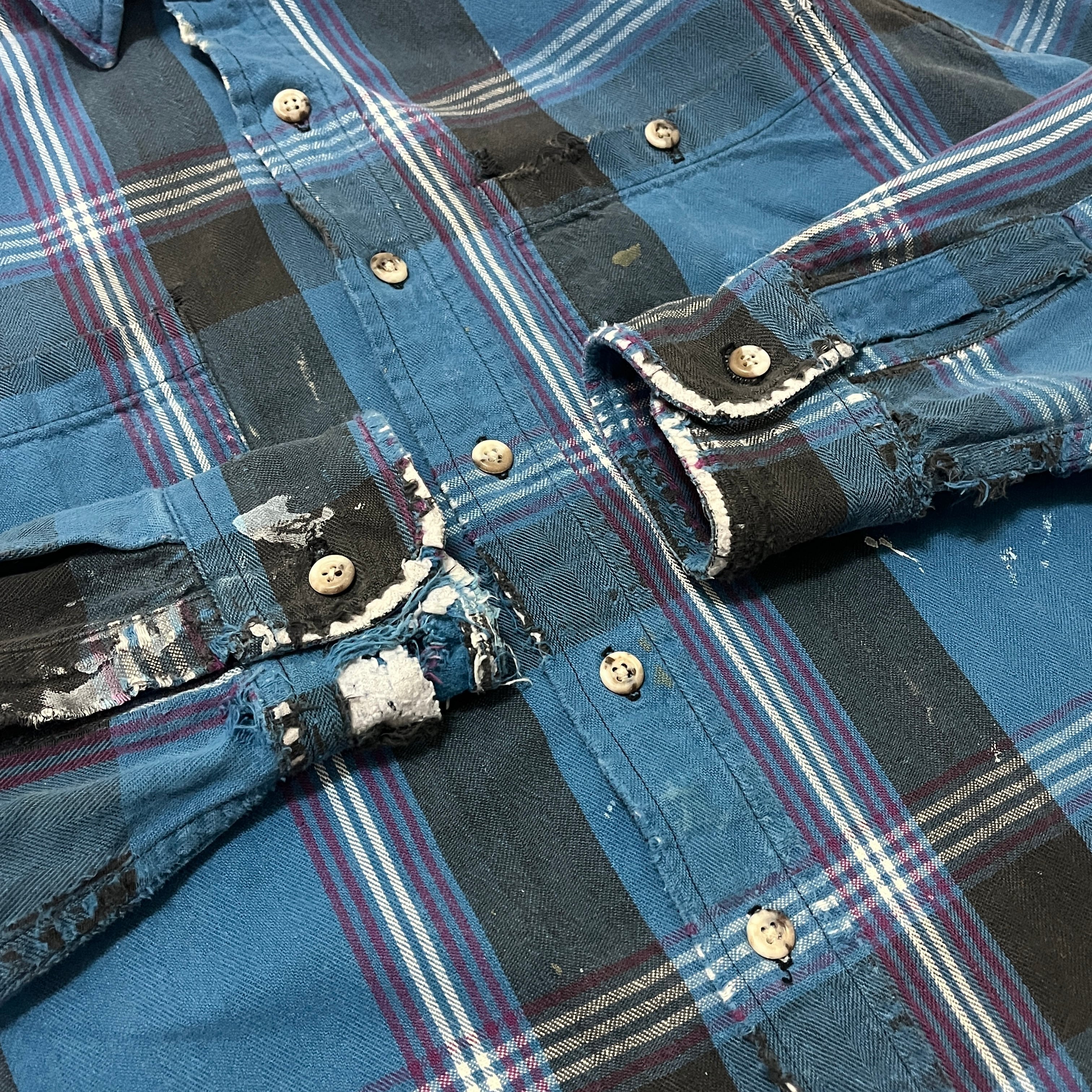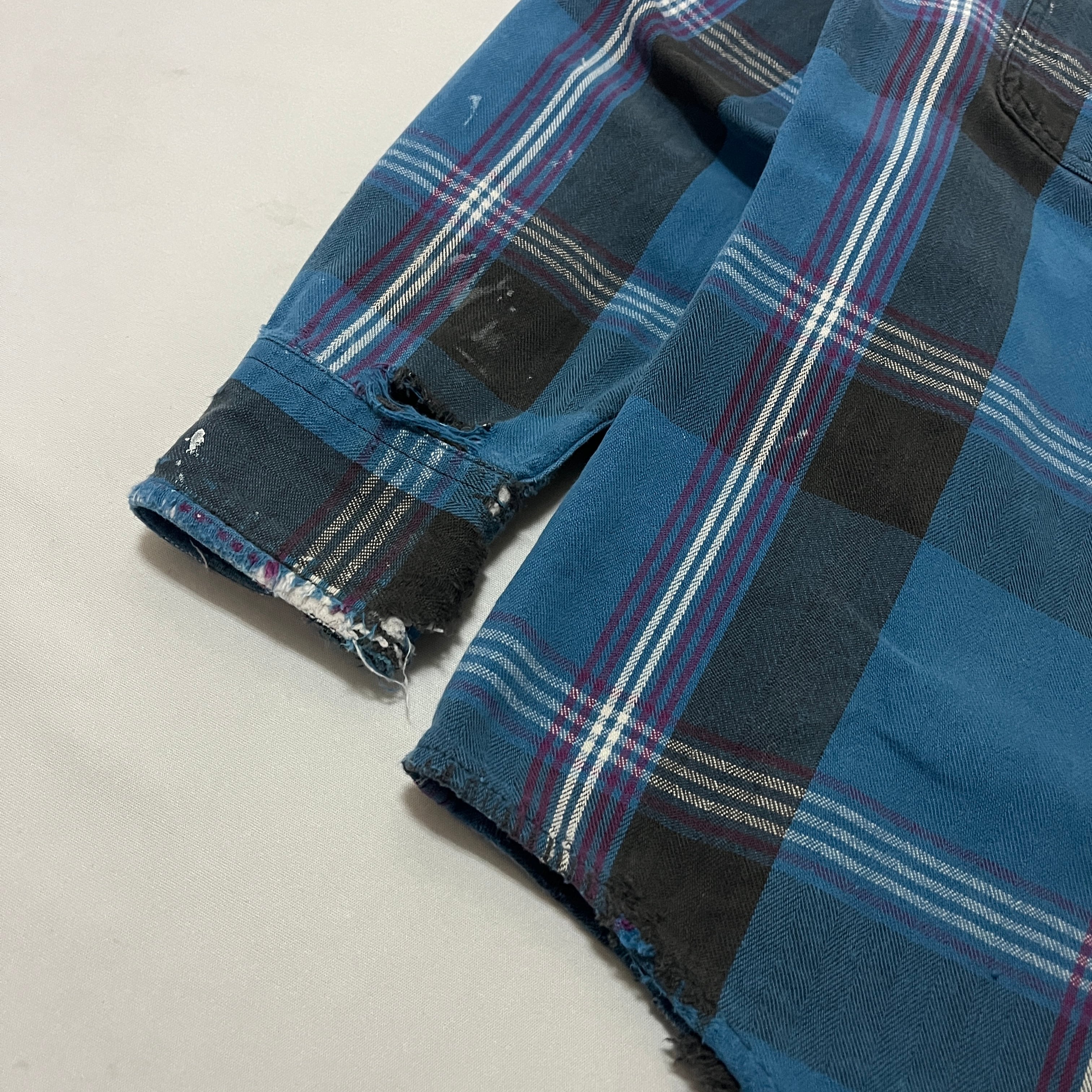 ■状態 全体的にペンキ飛び、両袖口、襟内側、両裾など全体的に擦り切れダメージ、小傷がございます。