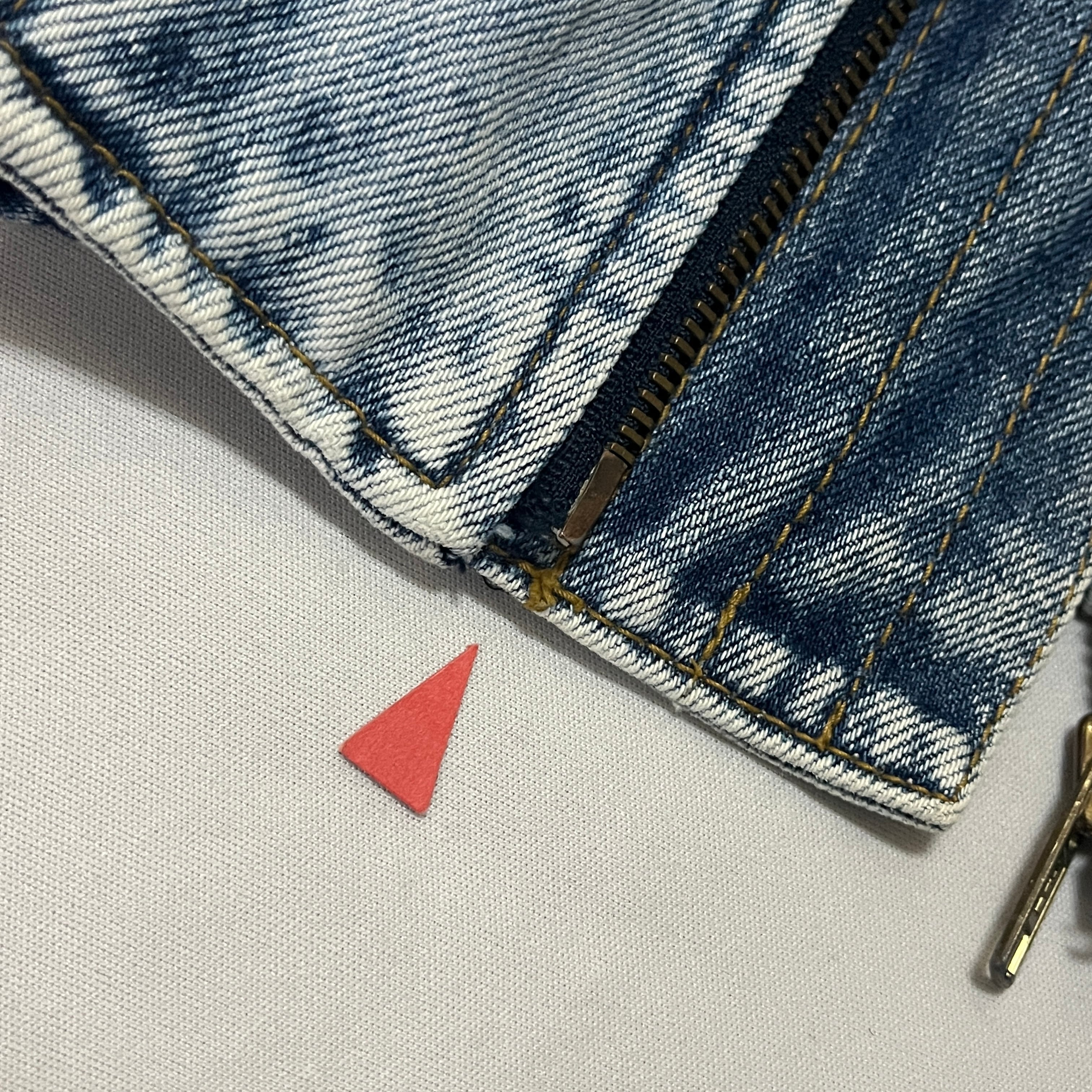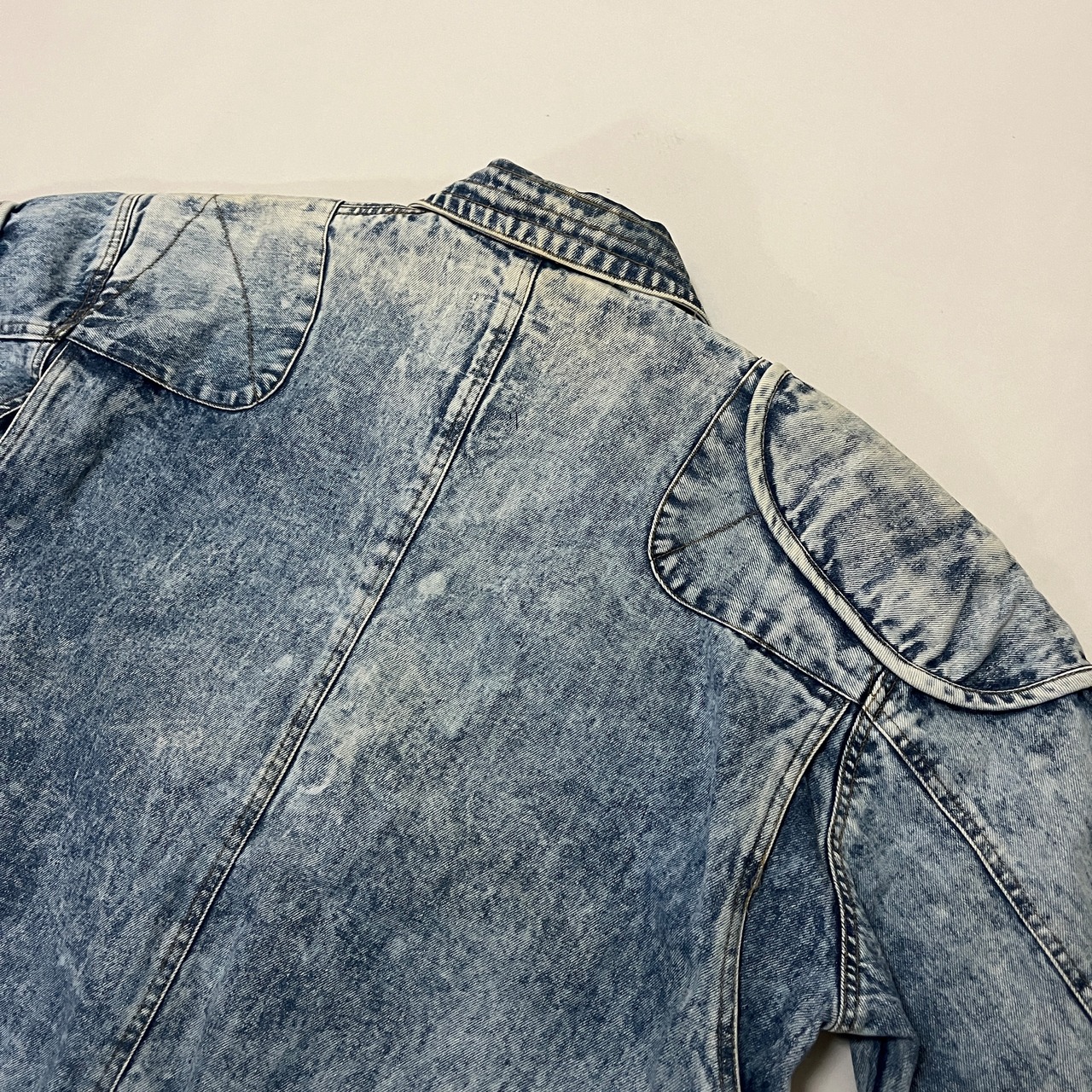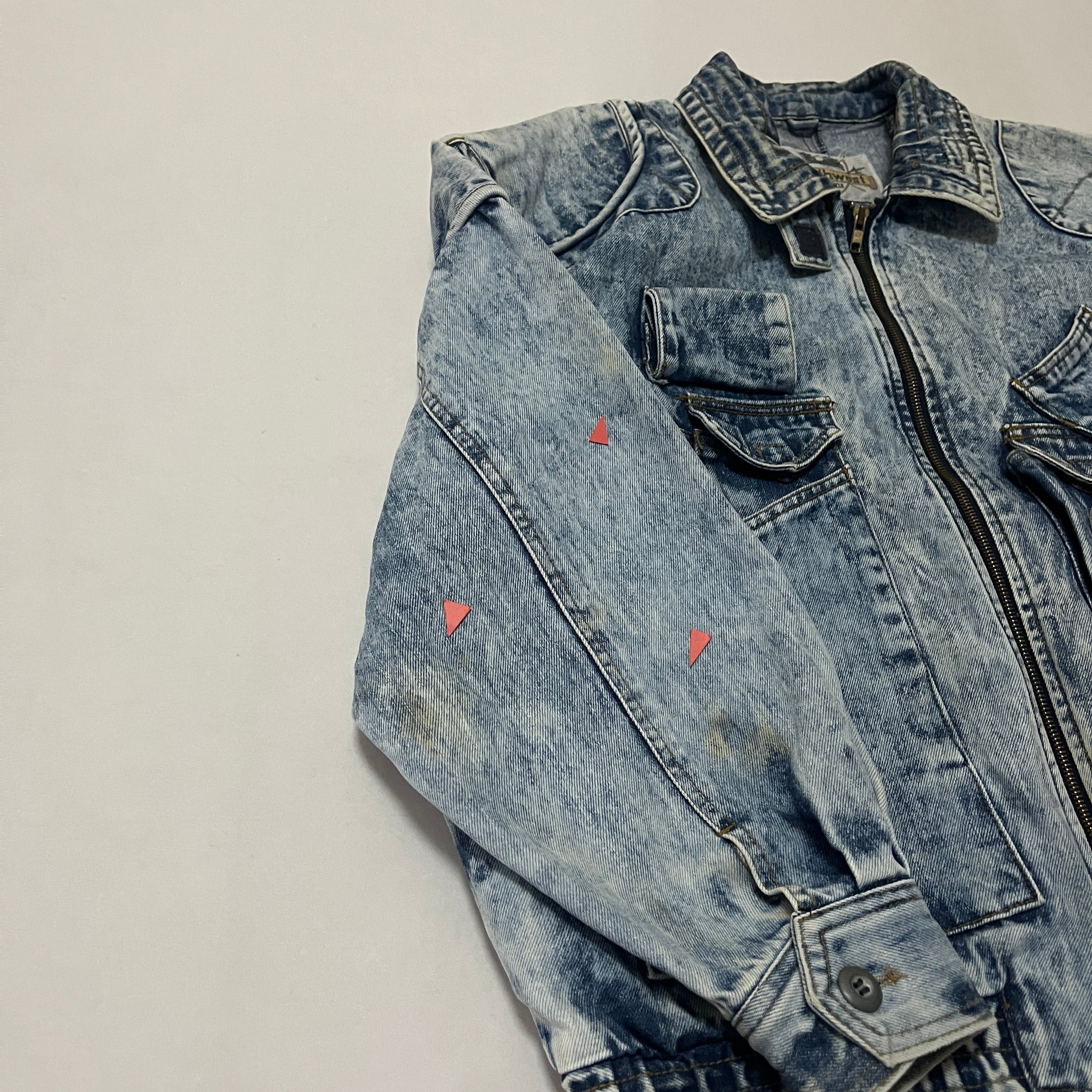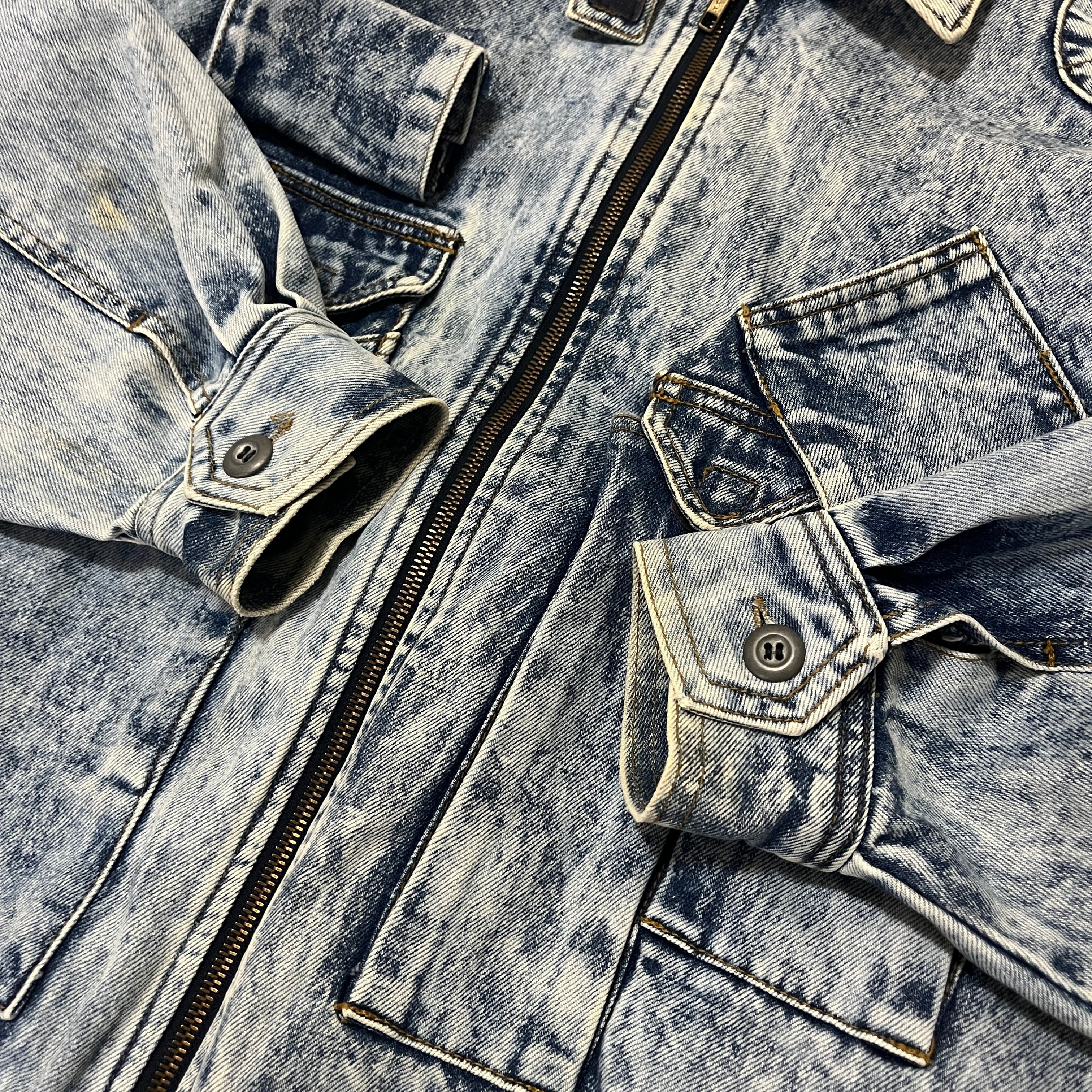 ■状態 全体的にケミカルウォッシュ特有の色落ち、右袖にうっすら黄ばみ、背中に色抜け、ジップエンドに小傷がございます。