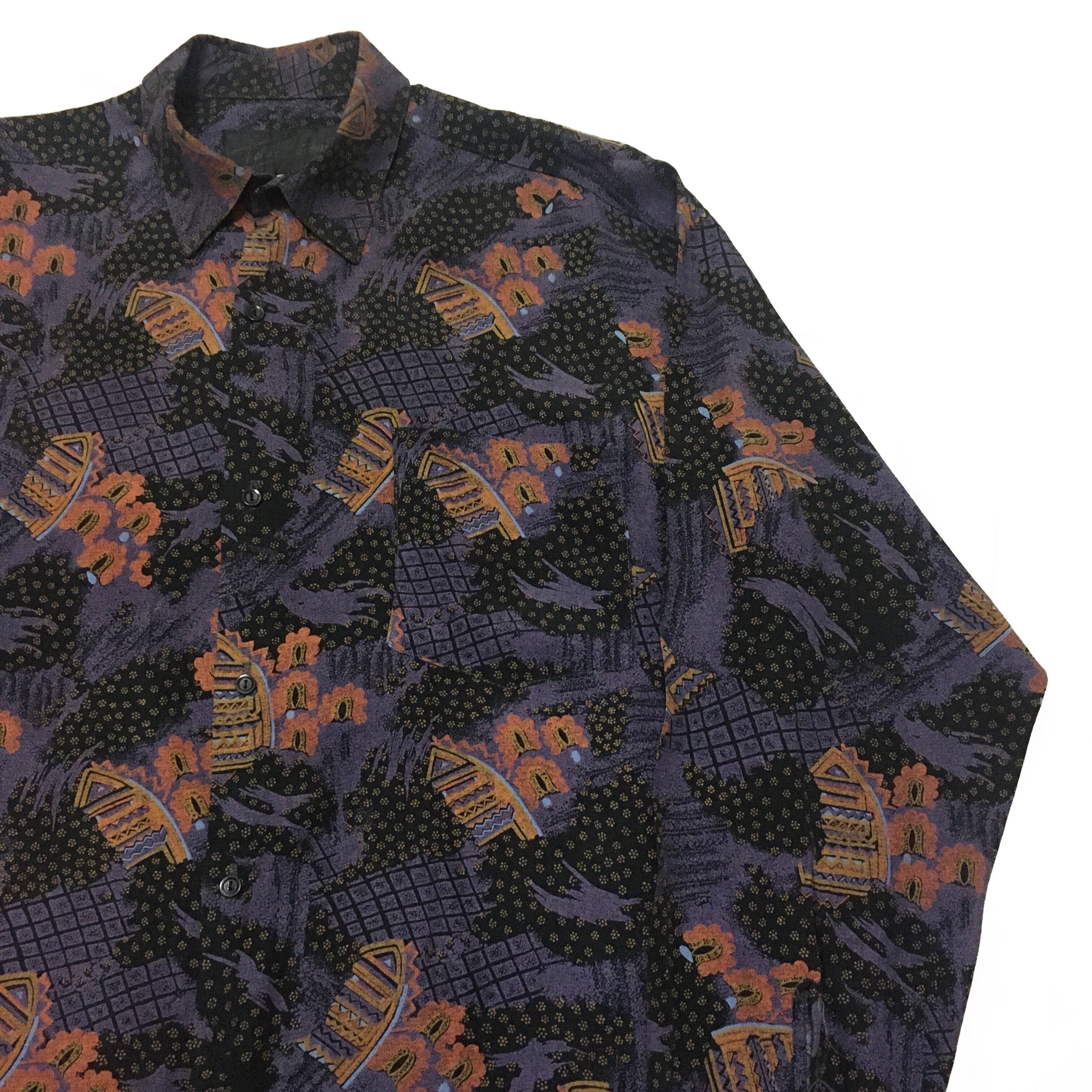 総柄 レーヨンシャツ パープル×ブラック L
