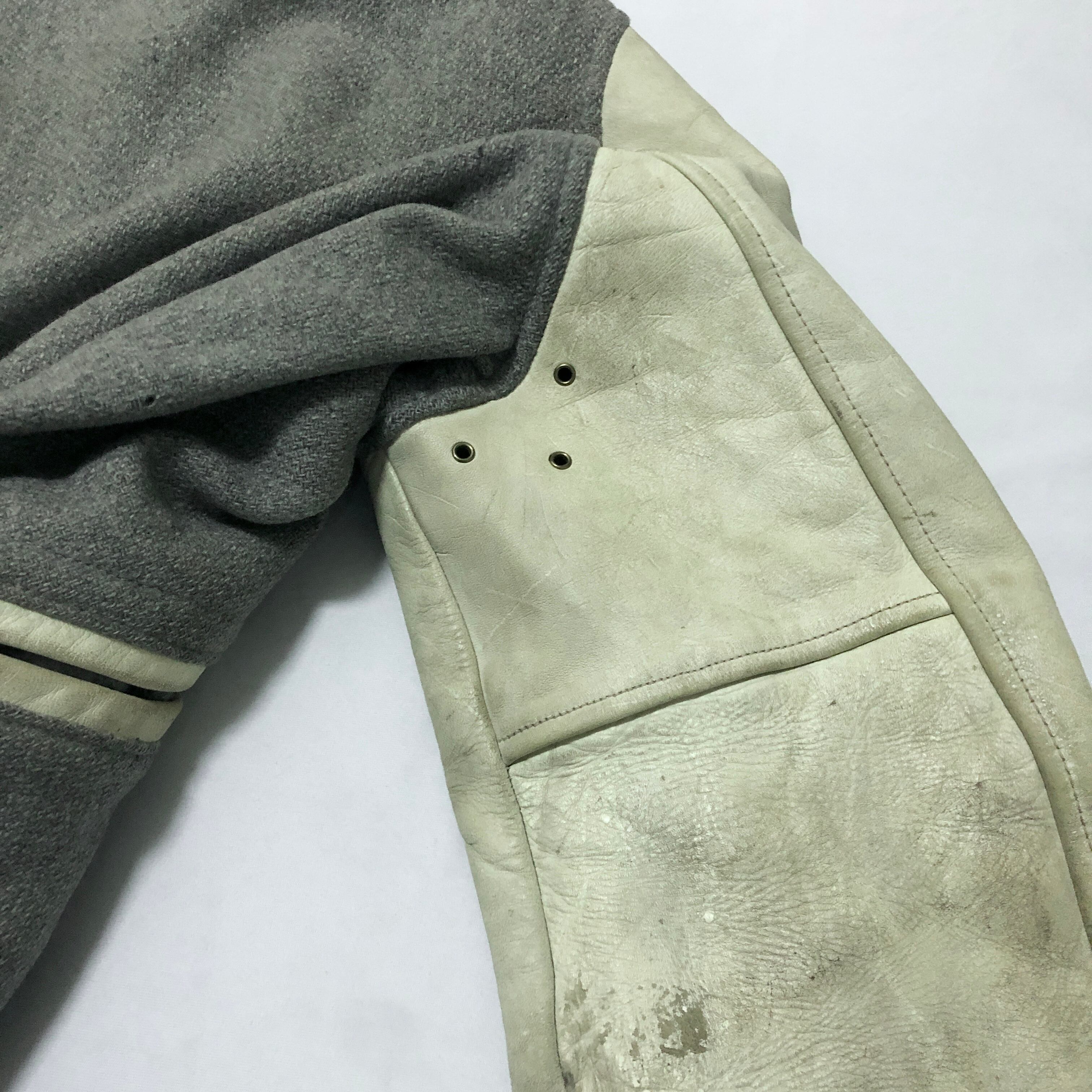 ■状態 写真のように、レザーに使用感、左腕にダメージ、右脇にダメージ、裏地に褪色、シミ、裏地、右肩の縫製部分に補修跡があります。