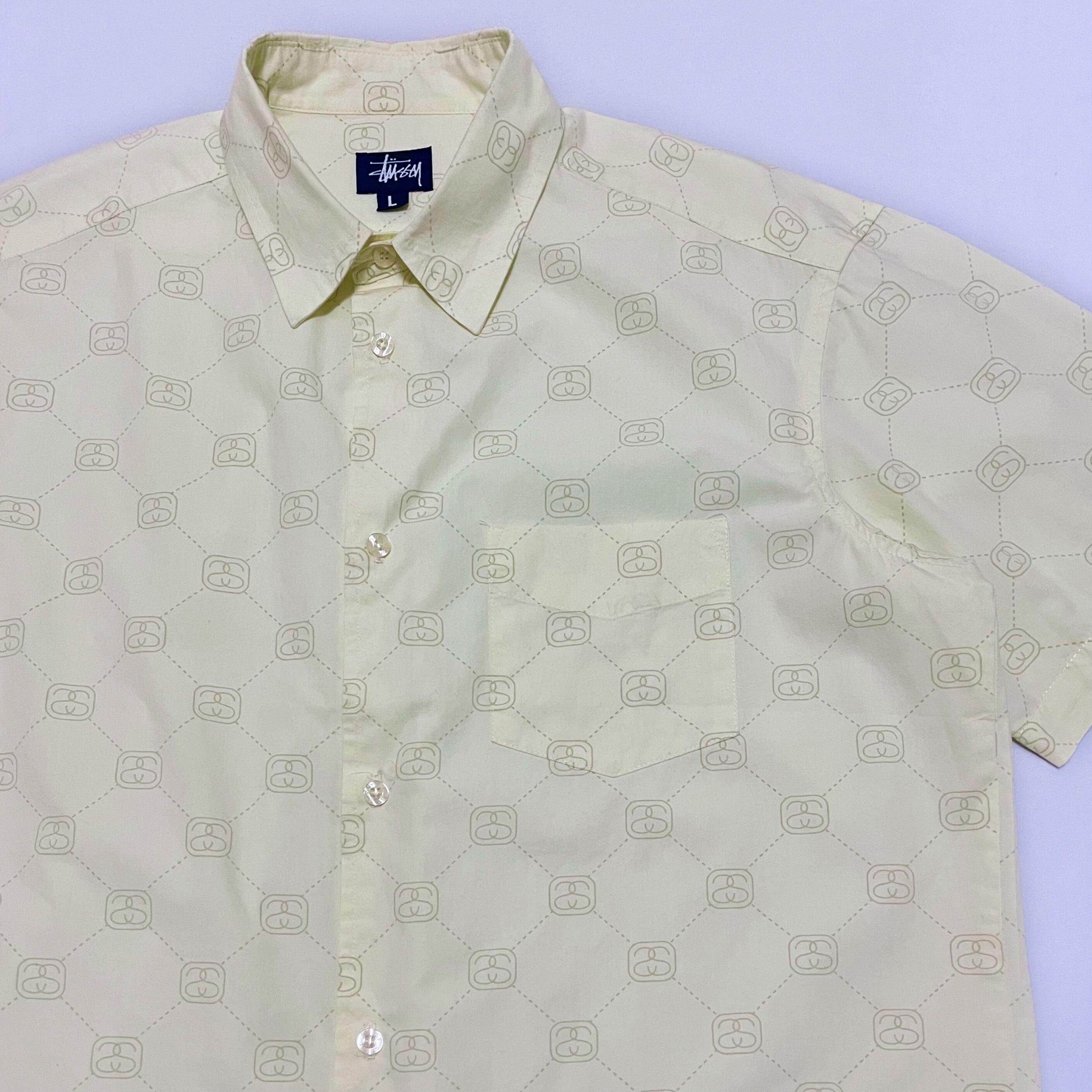 ■90年代USA製"Stussy"の半袖シャツです。CHANELのブランドロゴをモチーフにした総柄デザインです。