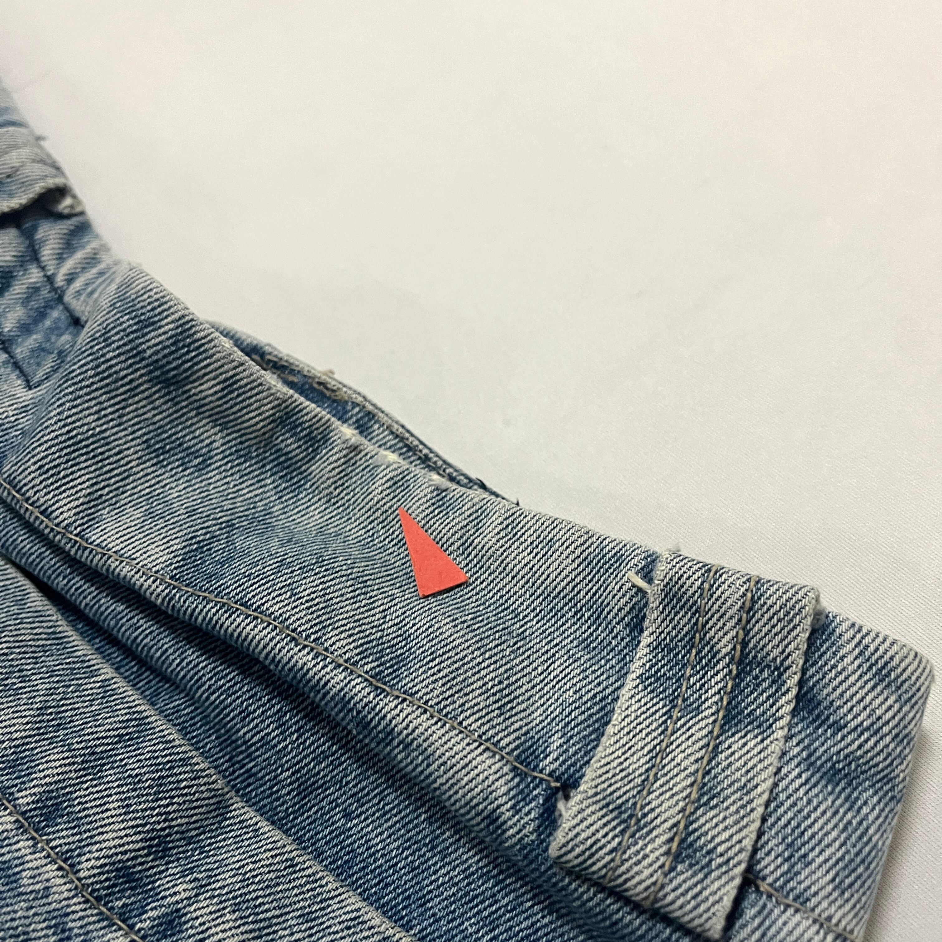 ウエスト部、右ポケットに擦り切れダメージ。左足後ろ裾ステッチ部にステッチ抜けがございます。