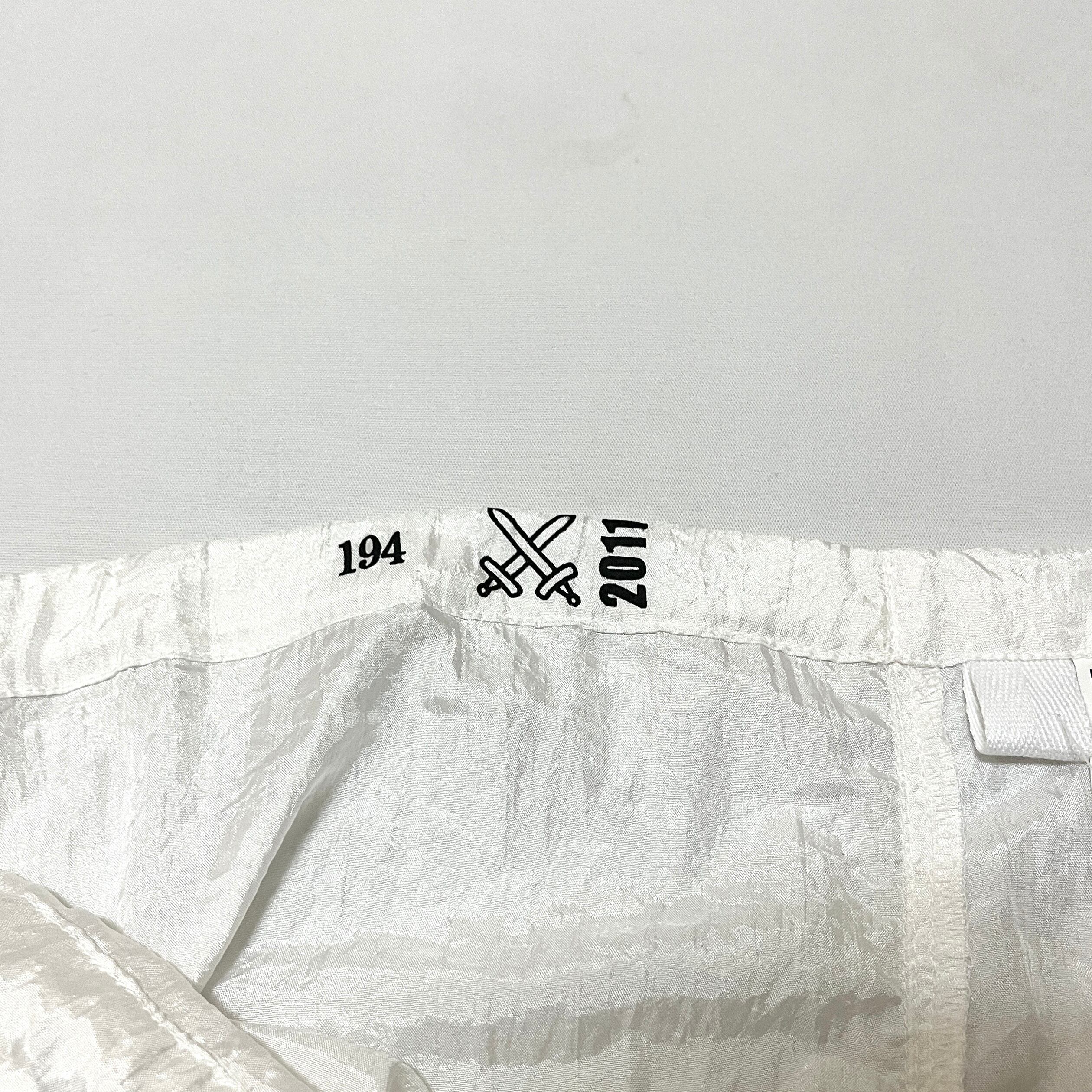 100%ポリメイド(ナイロン)素材の薄手で光沢のある素材感のスノーカモパンツです。ポケットは貫通式、裾はリブ仕様、右足膝付近がダブルニー仕様となっています。