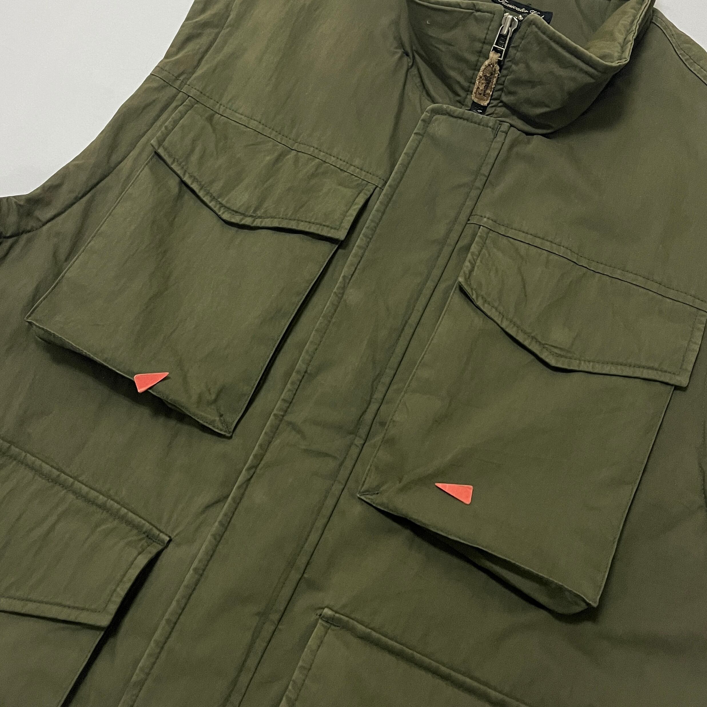 ■状態 襟内側、全体的に着用による色落ちがございます。前ポケットに小さな汚れ、左肩後ろに擦れ汚れがございます。