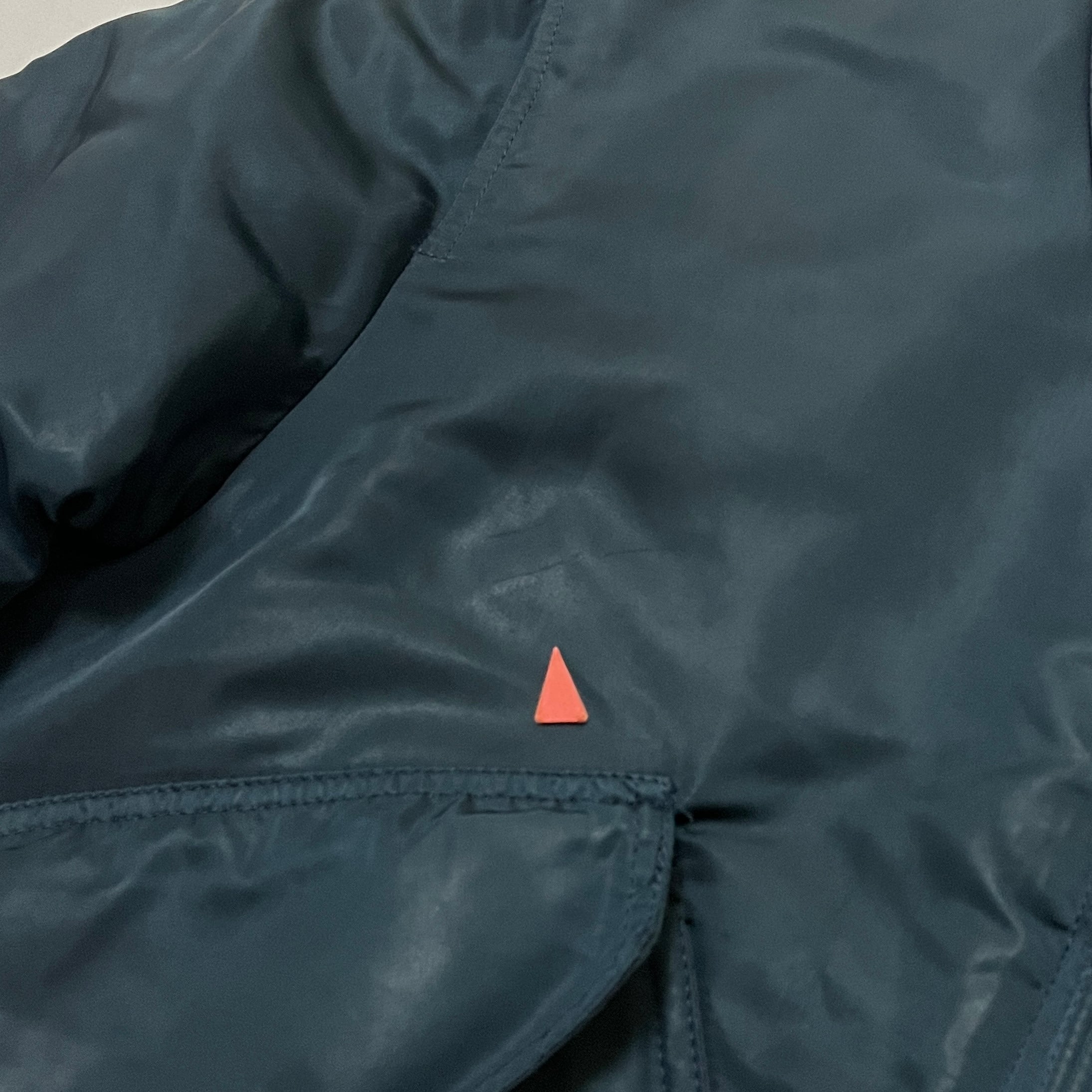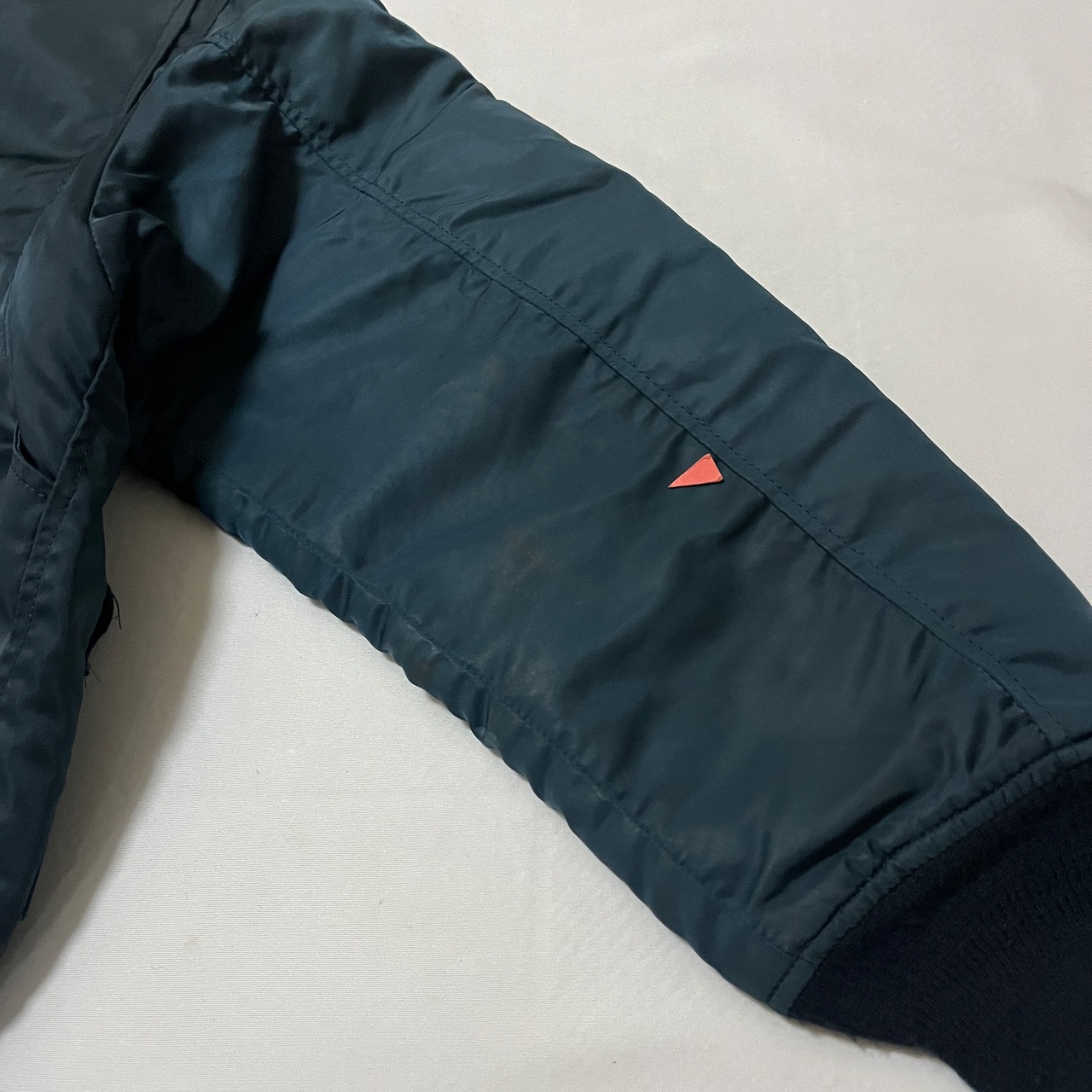 ■状態 全体的に着用による使用感、テカリ、裏地キルティング部に補修跡、両肩、右裾裏に擦り切れダメージ。胸部に小さな傷、右肘付近にサビ汚れ、右肩後ろに小さな擦れ汚れがございます。右ポケット部に小さな汚れがございます。