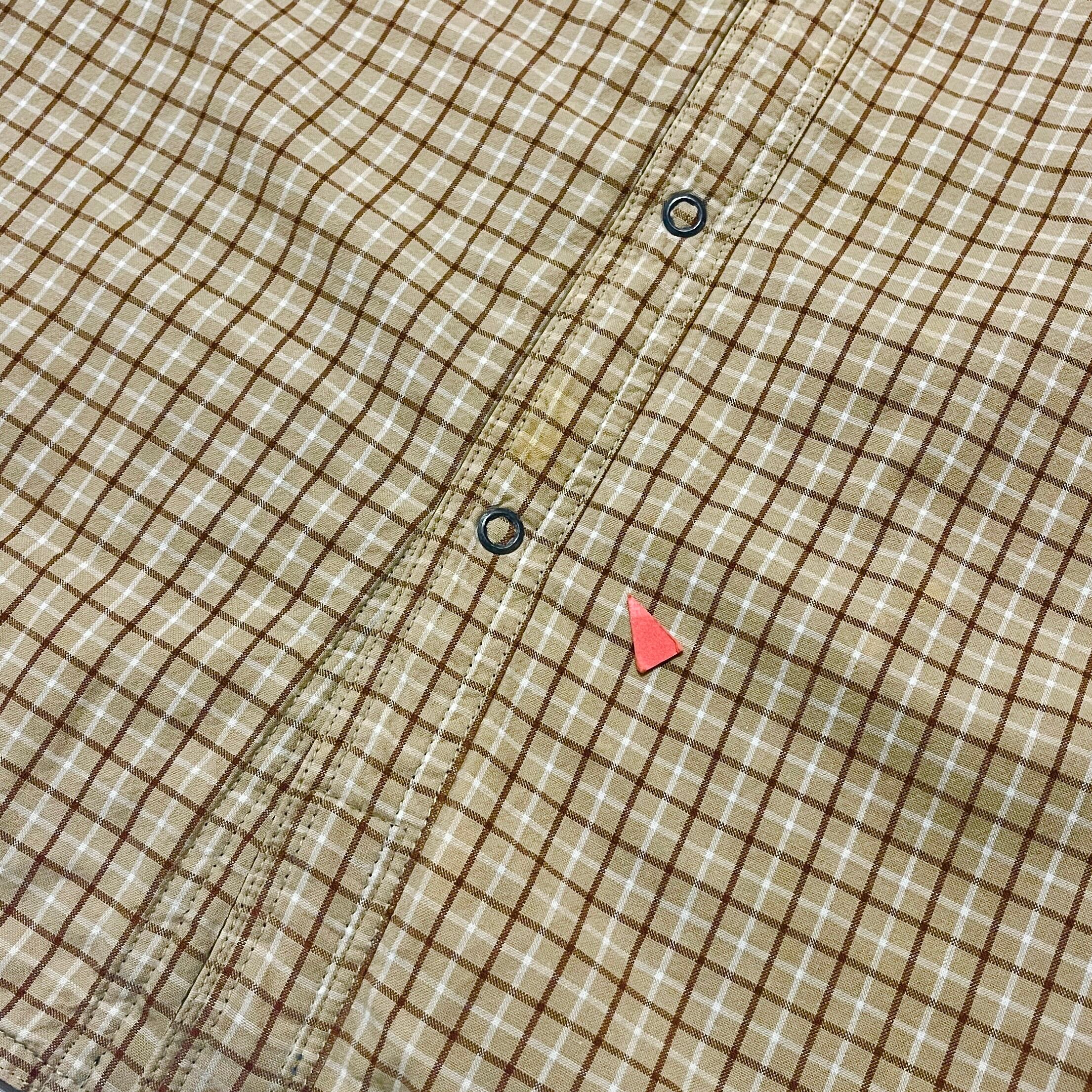 ■状態 チェック部、第6ボタン付近にシミ汚れ、両袖口に擦り切れ、うっすら黄ばみ汚れ、前裾、右袖に小さなサビ汚れがございます。
